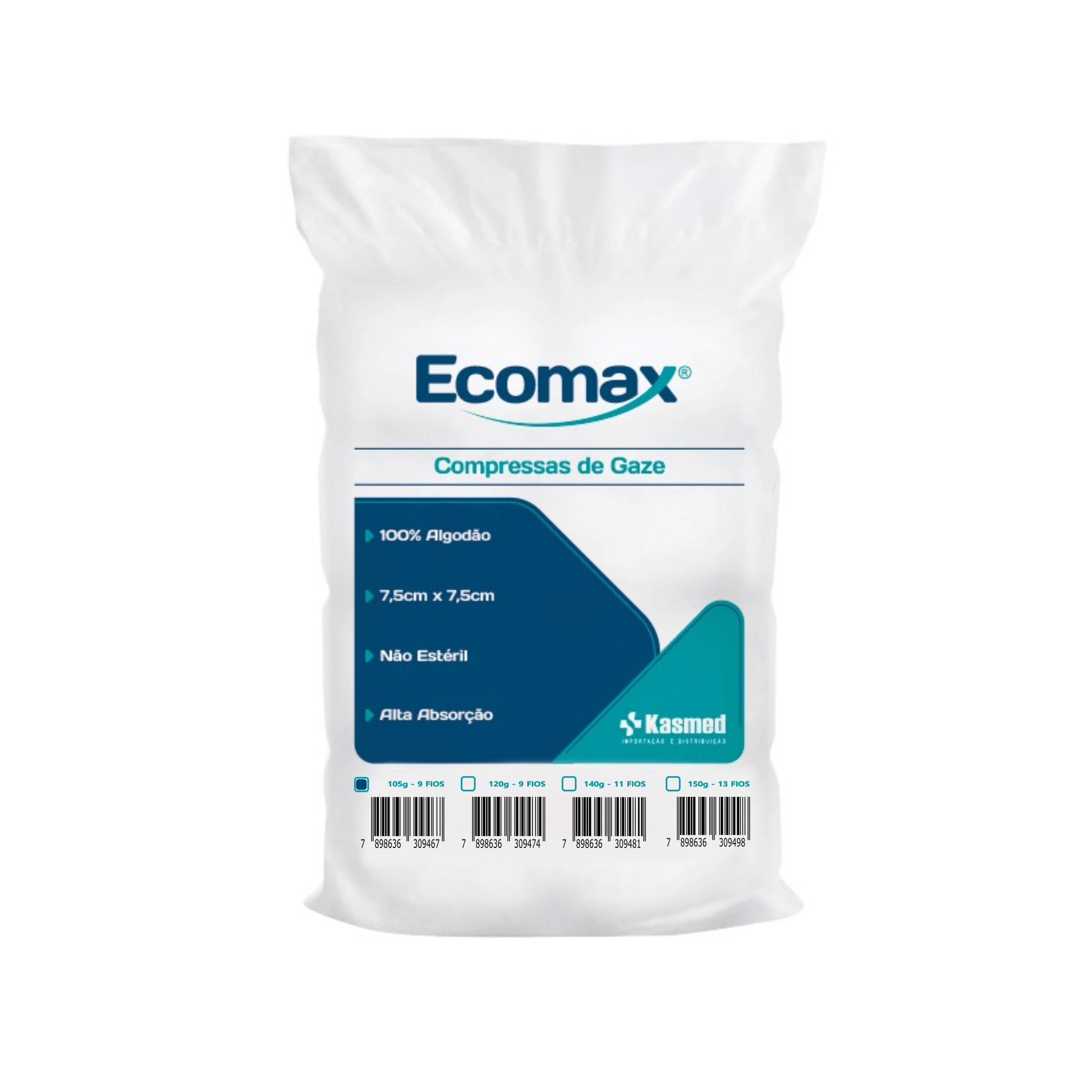 A kasmed confecciona compressas de gaze de alta qualidade e utiliza os mais puros fios de algodão, que, após várias etapas, tornam-se extremamente macias e absorventes. As compressas cirurgias de Gaze Hidrófila Ecomax, são fabricadas com o mais alto padrão, sendo isentas de substâncias gordurosas, corantes, corretivos, amido. Alvejantes ópticos e impurezas em geral. Tais agentes contaminam o produto, favorecendo sobremaneira a infecção hospitalar e as diversas formas de contaminação.